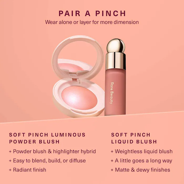 VeganThis weightless Rare Beauty Soft Pinch Liquid Blush delivers a long-lasting flush of color that blends effortlessly for a healthy-looking glow. Ideal for all skin types, the highly pigmented formula layers beautifully over liquid or powder makeup without disturbing it.